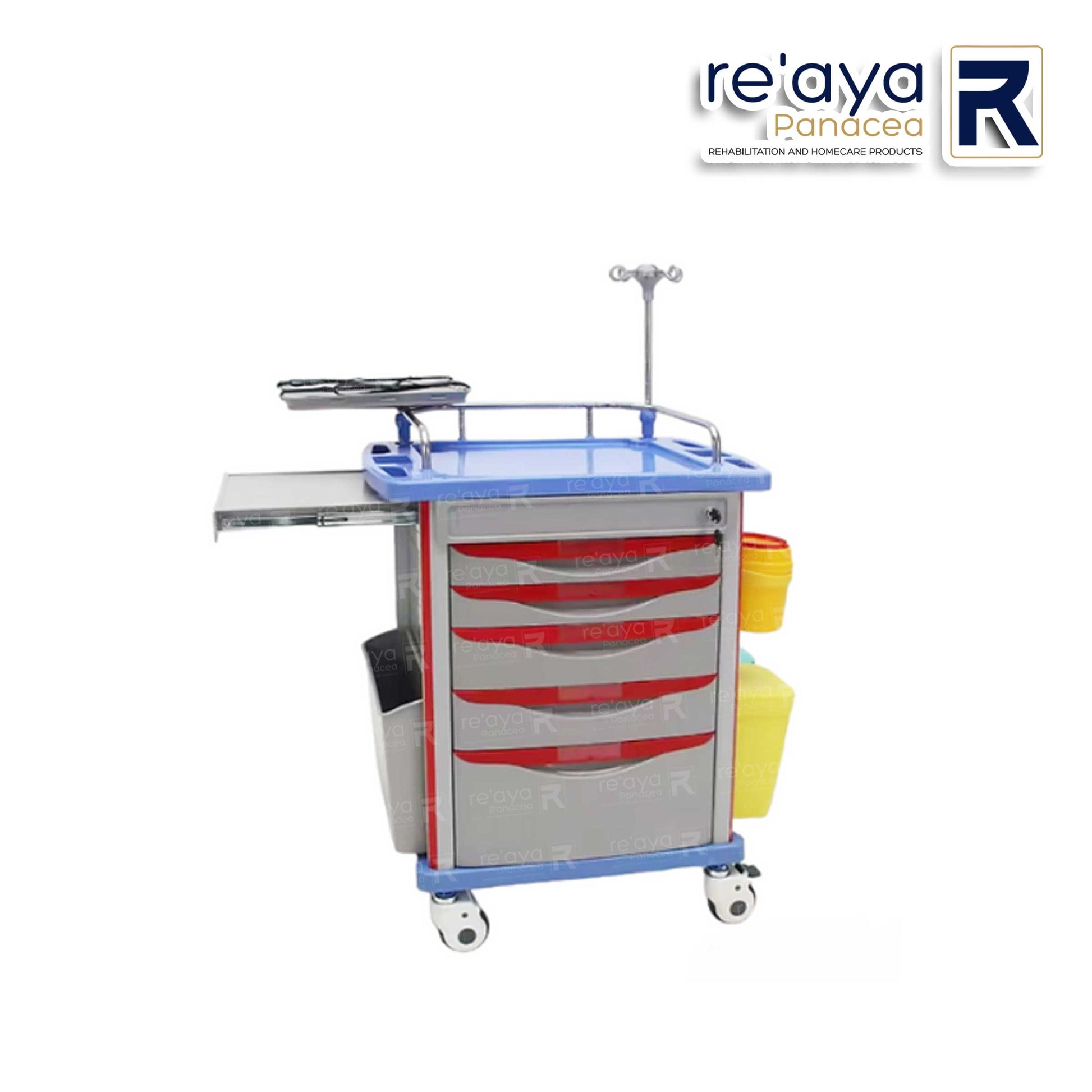 JEMP Assembly Line Trolley is a durable medical cart made from aluminum, steel, and ABS plastic. It features a strong four-column structure, retractable IV pole with rotary hooks, and a hidden oxygen cylinder bracket at the back. The front includes five soft-close drawers with a central lock, and the base is fitted with four 100mm silent wheels, two with brakes. Designed for flexibility, it also includes a universal power plug slot for international use.